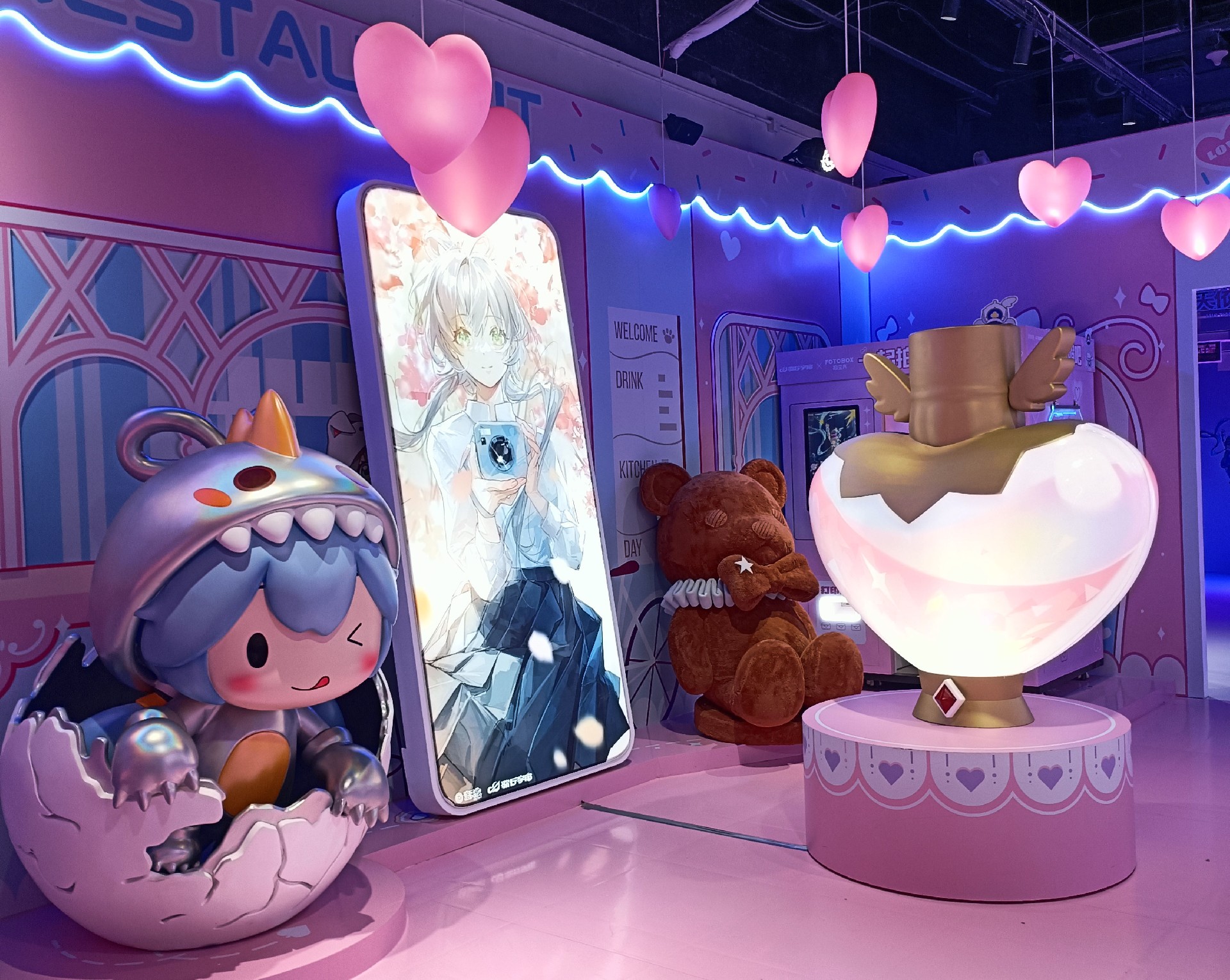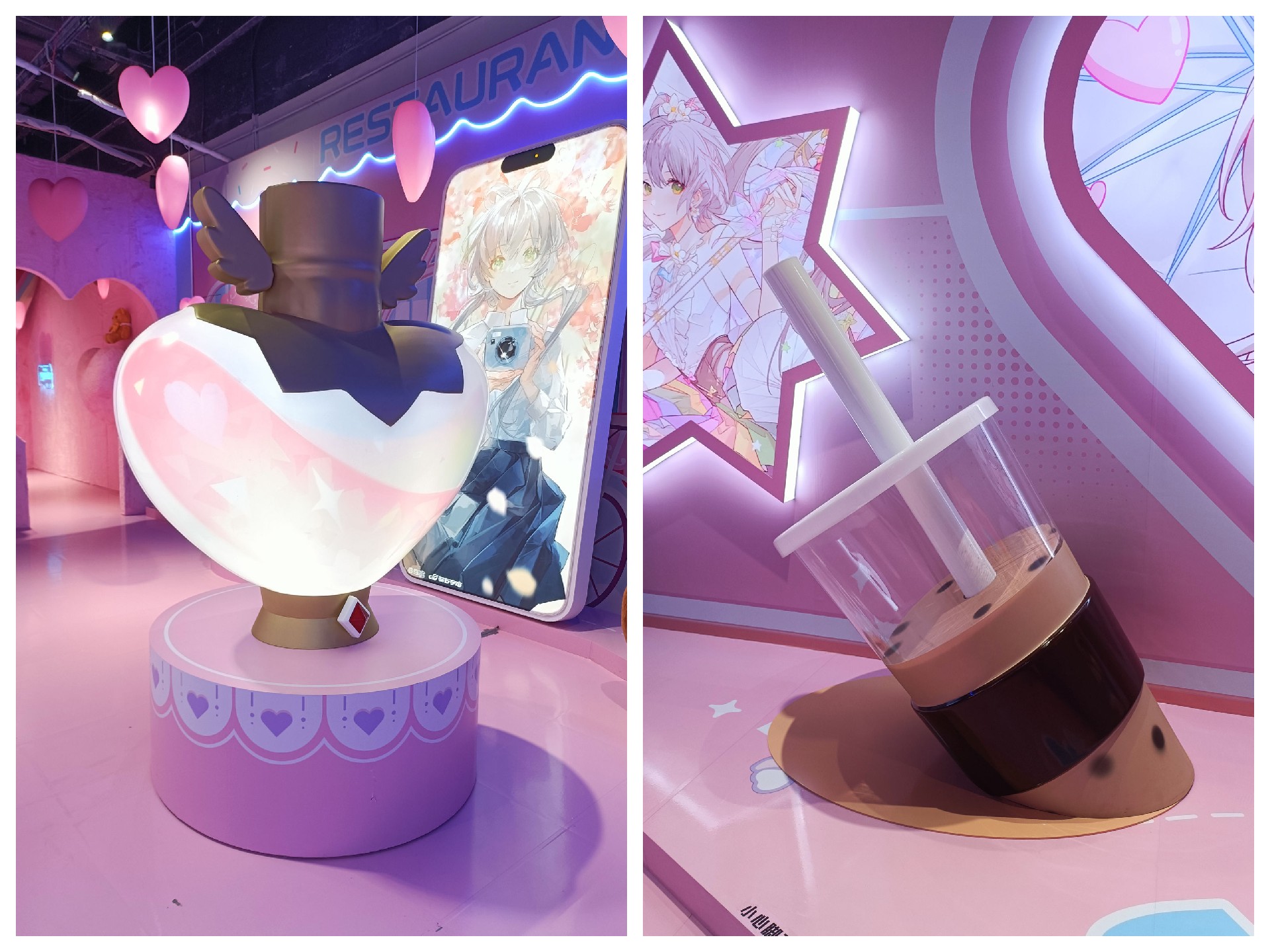 沉浸式展示道具用于產(chǎn)品的襯托和空間設(shè)計與環(huán)境的陳列搭配。今天分享一個應用案例,金秋上海月星環(huán)球港動漫歌手“洛天依沉浸式體驗展”中的兩個大型展示道具。一個是心形的吸塑造型,另一個是珍珠奶茶杯造型。這兩款道具采用了多種工藝和技術(shù),逼真得還原了品牌的設(shè)計元素,制作流程如下: